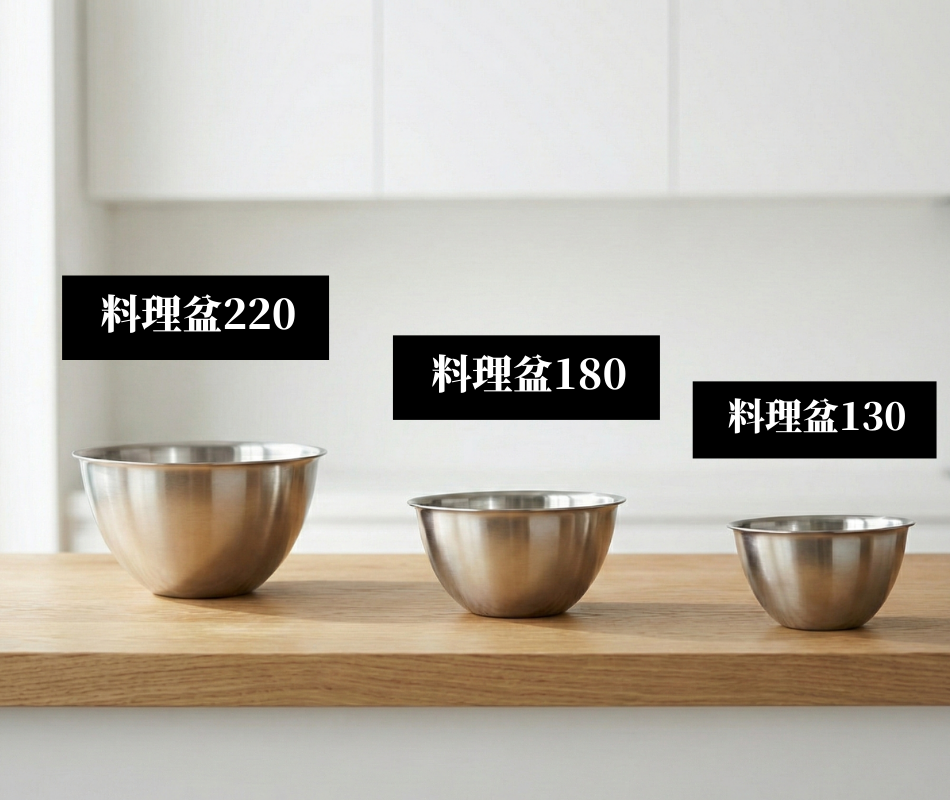 廚房料理盆有「130」、「180」、「220」三種尺寸,方便堆疊收納,不佔空間。