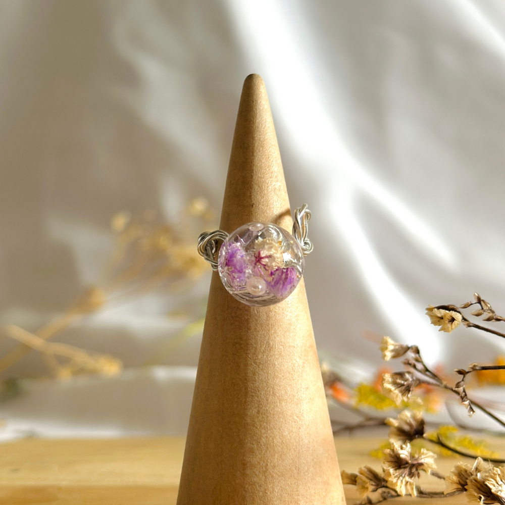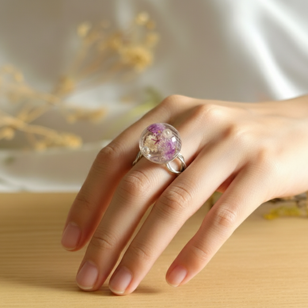 將乾燥花與亮片等素材用滴膠封入造型球中,並搭配金屬線圈,製作出專屬的夢幻戒指,彷彿將浪漫花語藏於指尖。