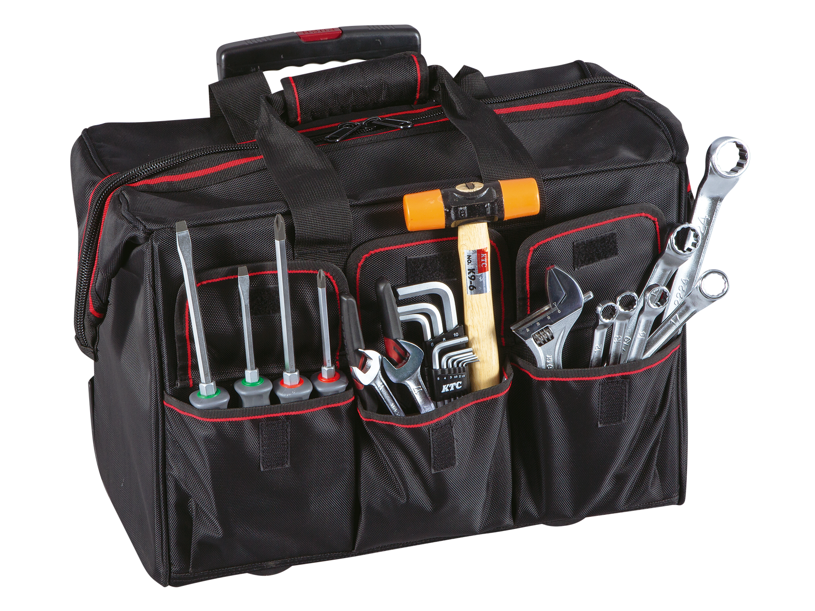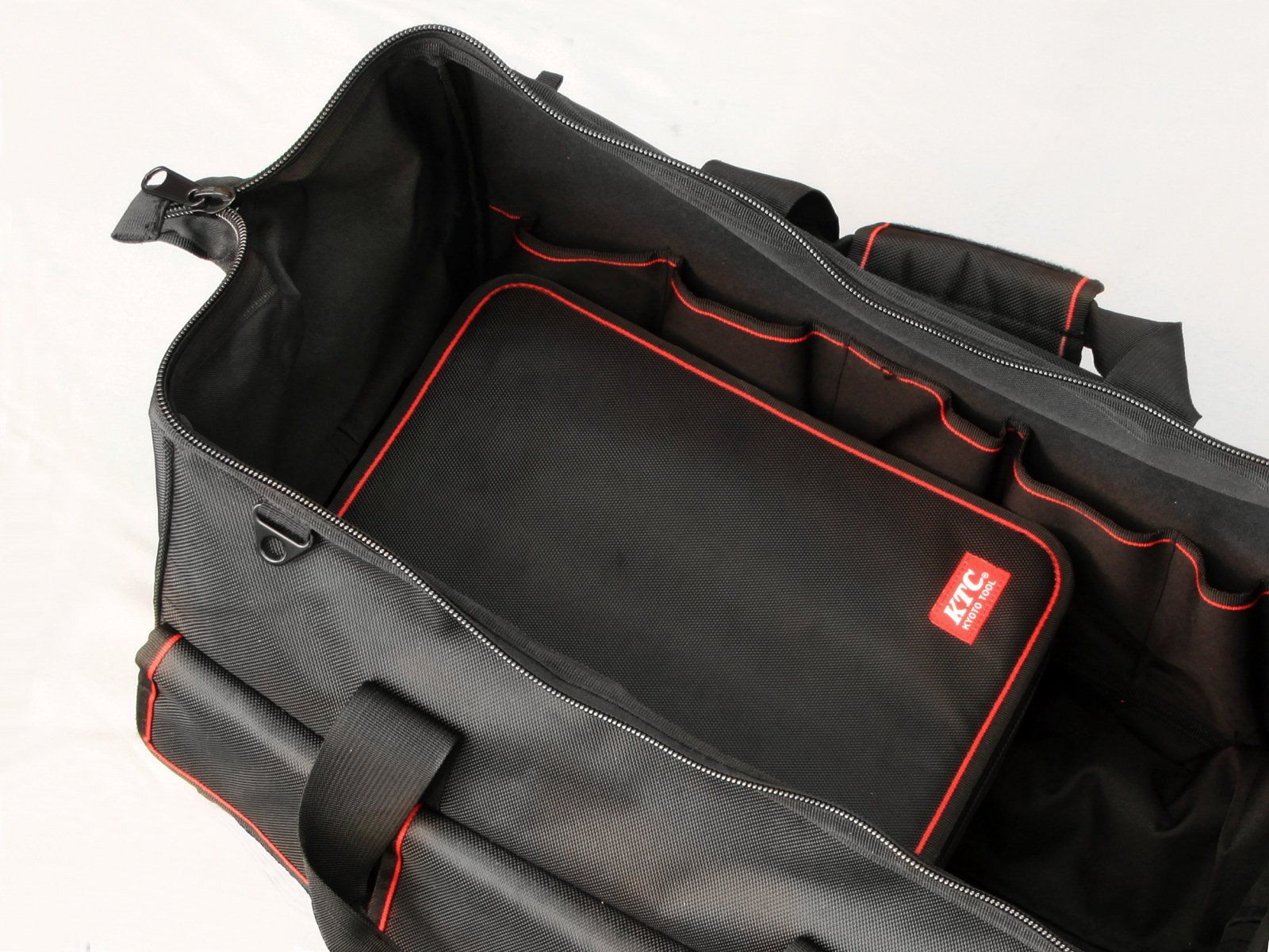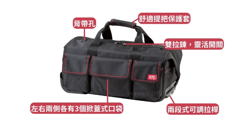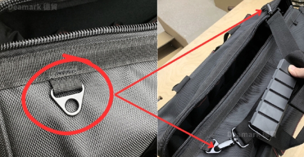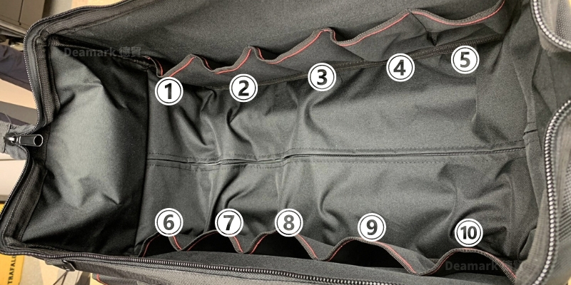 外部左右兩側各3個掀蓋式口袋(共6格),附有上蓋更加防潑水。內部左右兩側各5個口袋(共10格),小零件也能有最佳收納歸位。