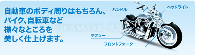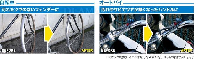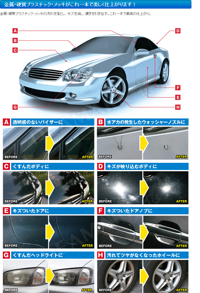 去除車身、車輪、車頭燈罩等金屬、硬質塑料、電鍍部件上的污垢、划痕、光澤。