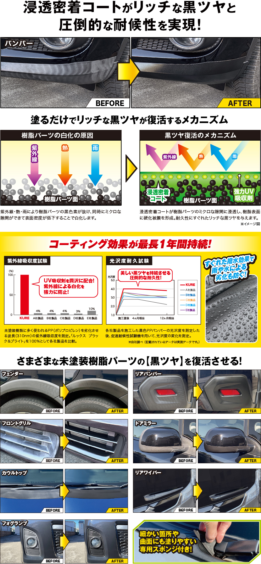 適用於未塗漆無加工的樹脂部位,可通過單次塗抹恢復已白化的樹脂部件的黑色光澤。