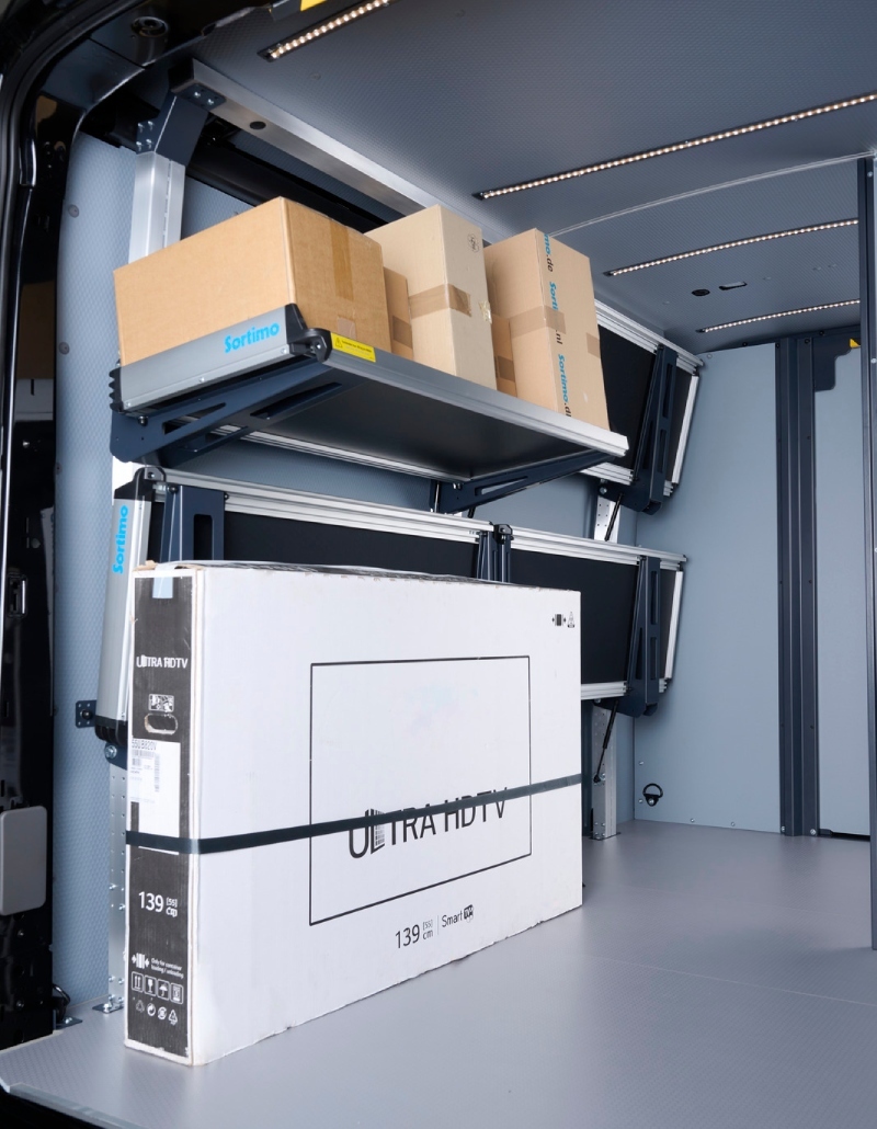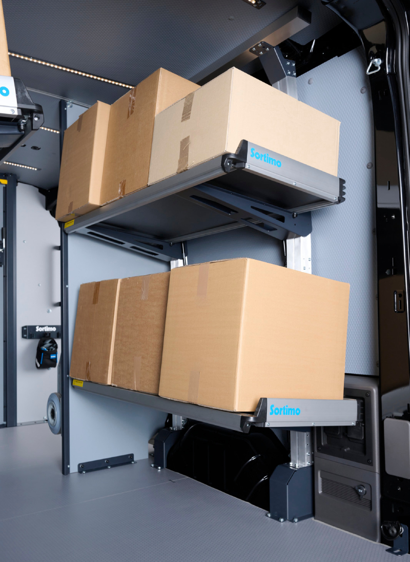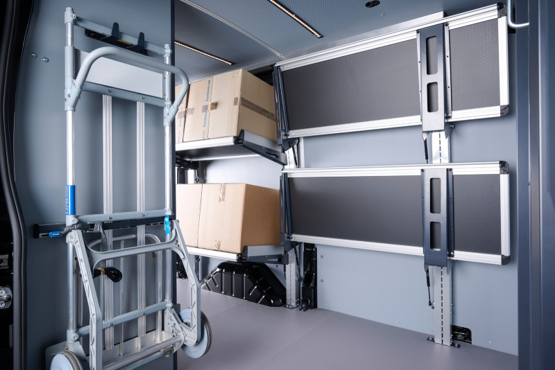 FlexRack 2.0 系列為車體壁掛層架,可依貨物大小多寡調整空間,每片層架皆可收折,並有完善的安全固定措施,確保人身及貨物運輸安全性。